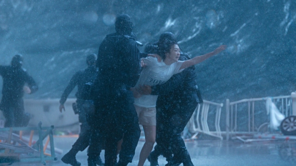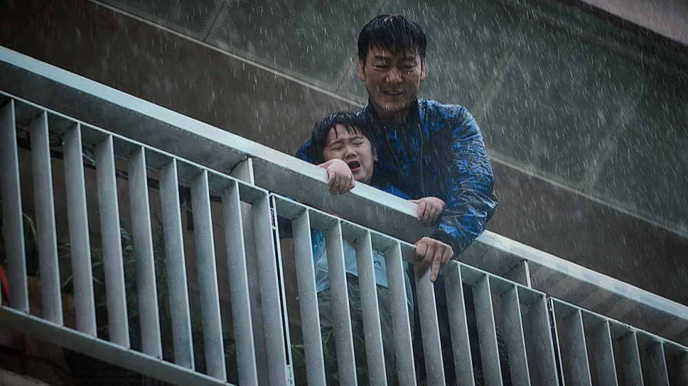 쓰나미가 미처 청소하지 못한 임산부가 하나 보인다. 애기아빠는 어떻게 해야 되냐 묻는데, 그냥 받아야지 뭘 어떡해. 대신 낳아줄 것도 아니고 어쩌라는 건진 잘 모르겠다. 어쨌든 쌩까고 올라간 김다미는 갑자기 짜증에 북받쳐 박해수에게 따져 묻는다. '애를 왜 놓고 가야 하는데요!!!' 애 버린다는 얘기를 애 듣는 옆에서 하고 있는 미친년이다. '내가 어떻게 혼자가요!!!'라 말하는 엄마 옆에서 뻘쭘하게 못 들은 척하고 있는 아역은 무슨 죄인가 싶다. 옥상 도착. 앞서 박해수가 밀려드는 인파 운운하며 폼을 잡던 것이 무안하게도 개미새끼 하나 없지만, 하긴. 박해수도 쓰나미 물청소는 몰랐겠지. 갑자기 애 머리카락 미는 건 노골적으로 감정을 주입하기 위한 연출일 뿐이니, 대충 <정이>에서 김현주 발가 벗겨 창녀로 써먹는 연출과 비슷하다 이해하면 무난할 것이다. 김다미가 쏟아지는 비 맞으며 무릎 꿇고 비는 장면은 7번 방의 선물에서도 본 듯한 충무로식 신파성 질감이고 말이다. 여하튼 박해수 리타이어 하며 홍수 재난은 끝난다. 여기까지가 50분.